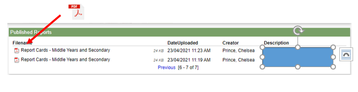 To access documents published to the portal (such as report cards or schedules, look under “Published Reports”, which is on the right hand side of the main screen. Click right beside the little PDF icon.