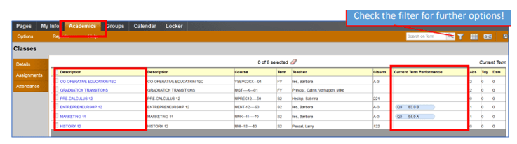 The Academics top tab provides information about students’ current standing in classes. See below: